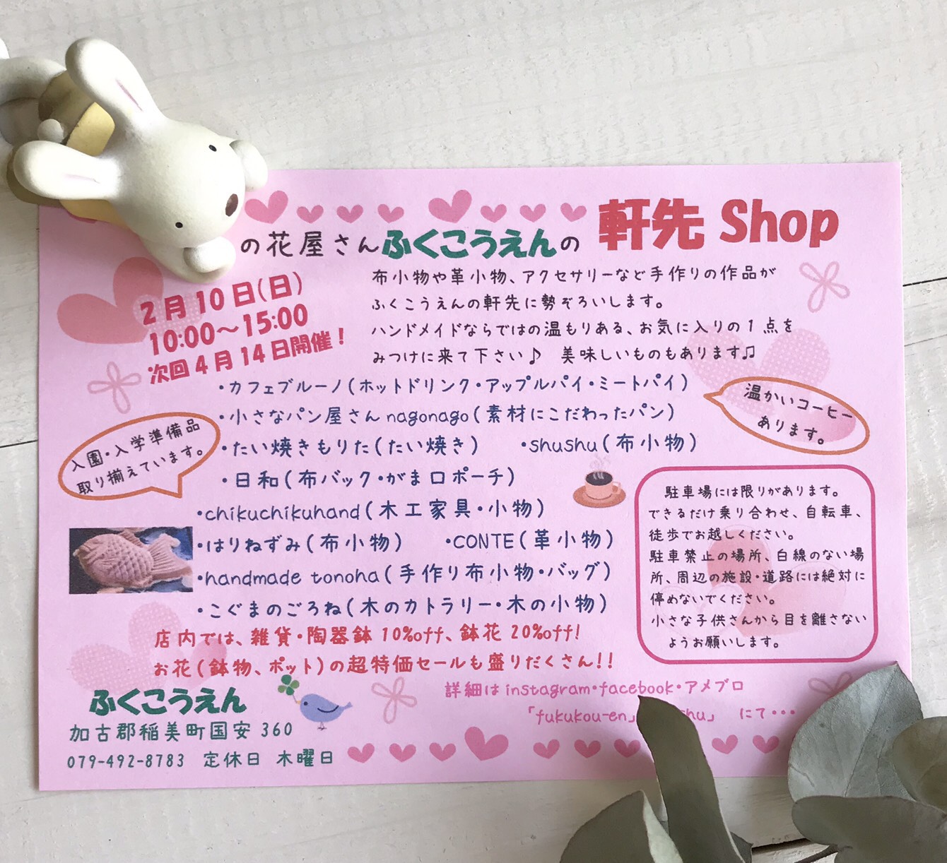 2月10日(日)10時~15時軒先ショップを開催します!当店のセールのご案内🎶・鉢花20%OFF 胡蝶蘭は除く・雑貨、陶器10%OFFその他、特価品を多数ご用意しております。入園、入学準備品など取り揃えておりますので、ぜひお越しになってご覧...
