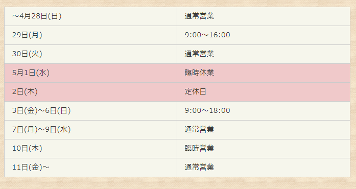 ゴールデンウィーク期間中の営業は下記のとおりです。~4月28日(日)通常営業29日(月)9:00~16:0030日(火)通常営業5月1日(水)臨時休業2日(木)定休日3日(金)~5日(日)9:00~18:006日(月)~8日(水)通常営業9...