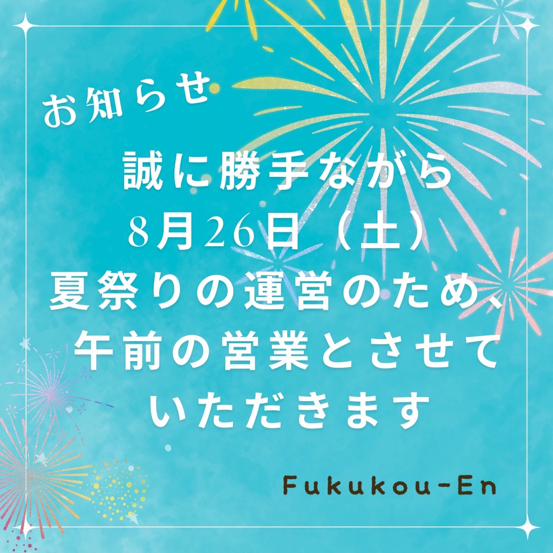 いつも当店をご利用いただきありがとうございます。誠に勝手ながら、8月26日土曜日は夏祭りの運営の為、午前の営業とさせていただきます。