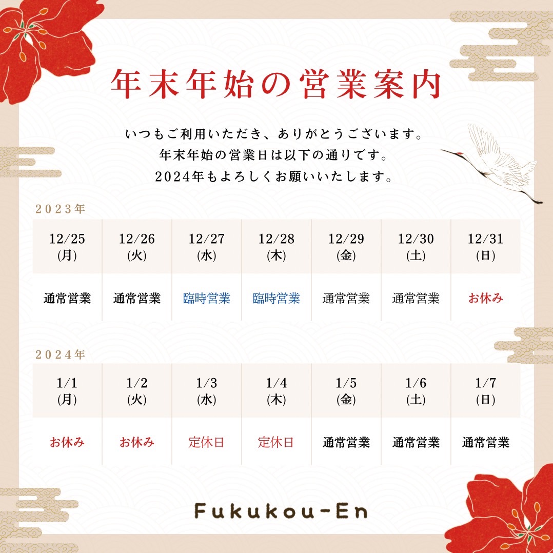 いつも当店をご利用いただきありがとうございます。年末年始の営業は下記の通りとなります。