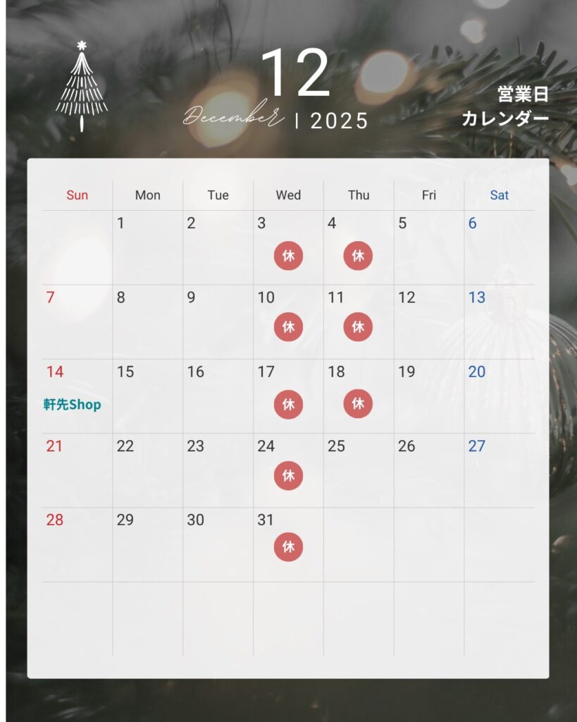 2025年12月および年末年始営業のお知らせ 最新 2025.12.01 いつも当店をご利用いただきありがとうございます。 12月および年末年始営業スケジュールは下記の通りとなります。 皆様のお越しをお待ちしております。 2025年12月 年末年始(2025~2026)