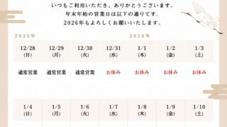 最新 2025年12月および年末年始営業のお知らせ いつも当店をご利用いただきありがとうございます。12月および年末年始営業スケジュールは下記の通りとなります。皆様のお越しをお待ちしております。2025年12月年末年始(2025~2026) 2025.12.01 最新